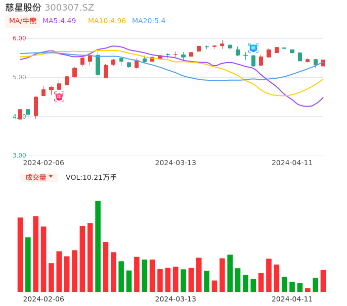 04月11日,慈星股份收报5.45,股价涨幅2.44%,成交金额5516.82万元,换手率1.31%。
