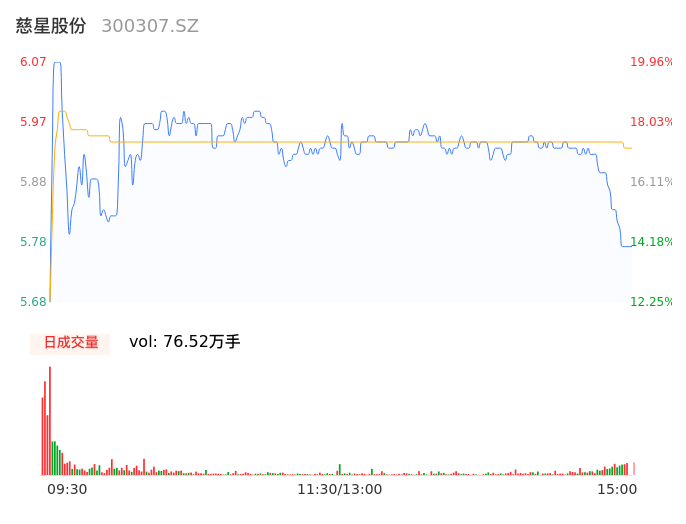 04月26日,慈星股份收报5.77,股价涨幅14.03%,成交金额4.54亿元,换手率9.84%。