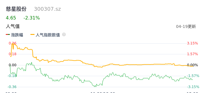 04月19日,慈星股份收报4.65,股价涨幅-2.31%,成交金额4172.14万元,换手率1.15%。