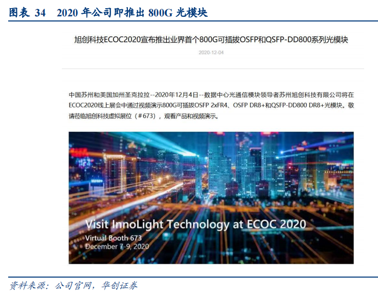 前瞻性布局800G,于行业内率先发布800G产品。根据公司官网发布信息,公司在2020年的ECOC2020线上展会上就已经演示800G可插拔OSFP2xFR4、OSFPDR8+和QSFPDD800DR8+光模块,其中QSFP-DD800DR8+于2021年1月面向市场,其他800G产品在2021年上半年进行送样评估,并于2021年第四季度、2022年第一季度陆续进行批量生产。公司是业内首个推出800G可插拔光模块的公司,领先行业其他竞品公司将近一年。根据公司公开投资者问答,目前800G已实现量产,并在2023年成为公司主力产品,预计2024年将持续上量。