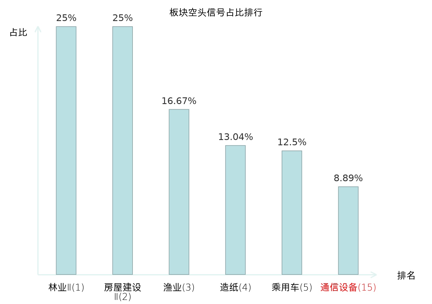 全市场所有行业板块中主力空头信号占比排名中,林业Ⅱ板块位居第一。通信设备板块名次提升最快,较昨日上升115位。