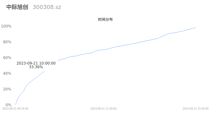 首先我们来看当日成交的时间分布。将今日交易时间按照5分钟的时间间隔进行切片,并绘制分布直方图进行观察。可以发现,10点之前的成交量占全天成交量的33.36%,这说明,该股票活跃时段换手火爆,资金热情高涨。