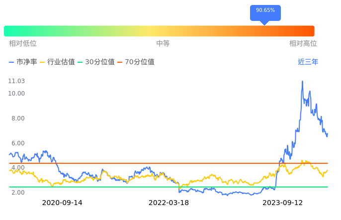 中际旭创当前市净率PB为6.80,在所属的通信设备中,市净率PB排76,前五名分别为亨通光电市净率1.45、中天科技市净率1.54、*ST新海市净率1.59、辉煌科技市净率1.61、长江通信市净率1.74。中际旭创当前市净率PB为6.80,超过近3年90.65%的历史数据。