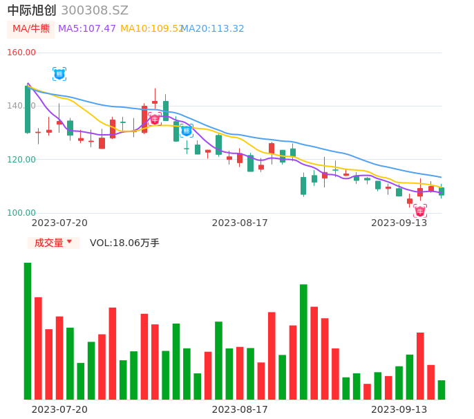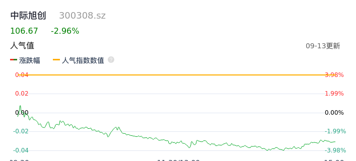 09月13日,中际旭创收报106.67,股价涨幅-2.96%,成交金额19.41亿元,换手率2.41%。