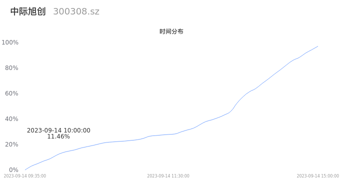 300308中际旭创2023年09月14日成交24.63万手,成交金额25.77亿元,相较昨日放量6.57万手,换手率3.28%,成交清淡。