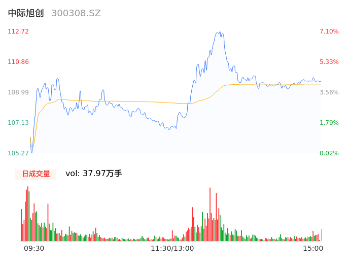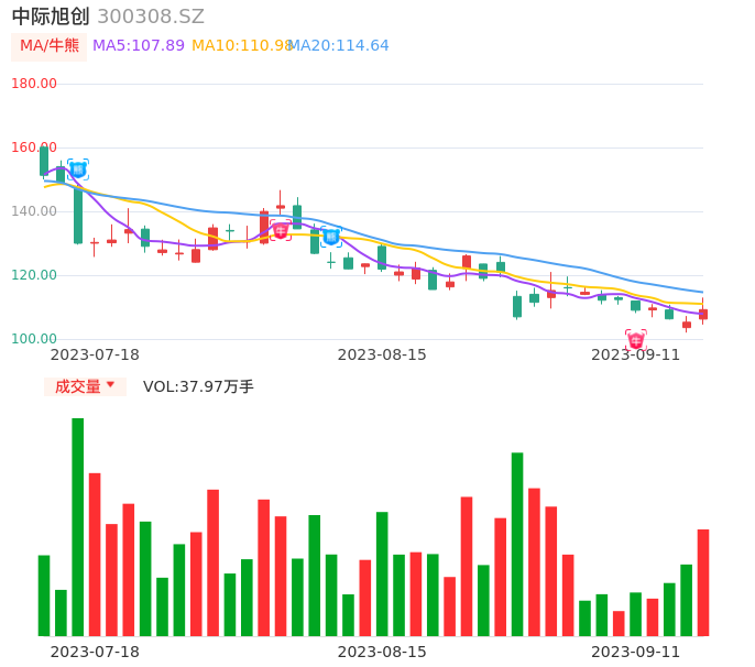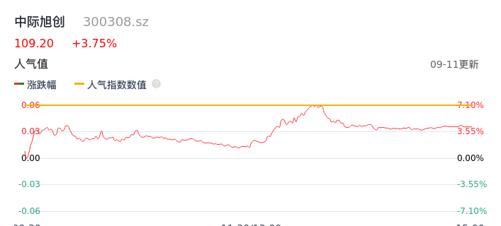 09月11日,中际旭创收报109.20,股价涨幅3.75%,成交金额41.58亿元,换手率5.06%。