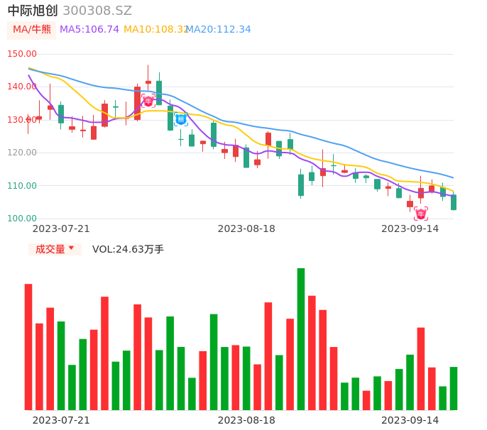 09月14日,中际旭创收报102.65,股价涨幅-3.77%,成交金额25.77亿元,换手率3.28%。