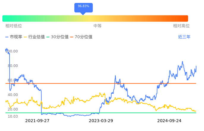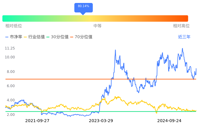 中际旭创当前市净率PB为8.46,在所属的通信设备中,市净率PB排78,前五名分别为ST高鸿市净率1.02、共进股份市净率1.09、鼎信通讯市净率1.18、美利信市净率1.25、星网锐捷市净率1.31。中际旭创当前市净率PB为8.46,超过近3年80.14%的历史数据。
