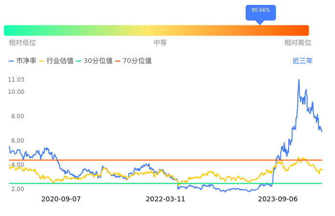 中际旭创当前市净率PB为6.57,在所属的通信设备中,市净率PB排75,前五名分别为高鸿股份市净率1.35、亨通光电市净率1.43、中天科技市净率1.54、*ST新海市净率1.56、辉煌科技市净率1.60。中际旭创当前市净率PB为6.57,超过近3年90.66%的历史数据。