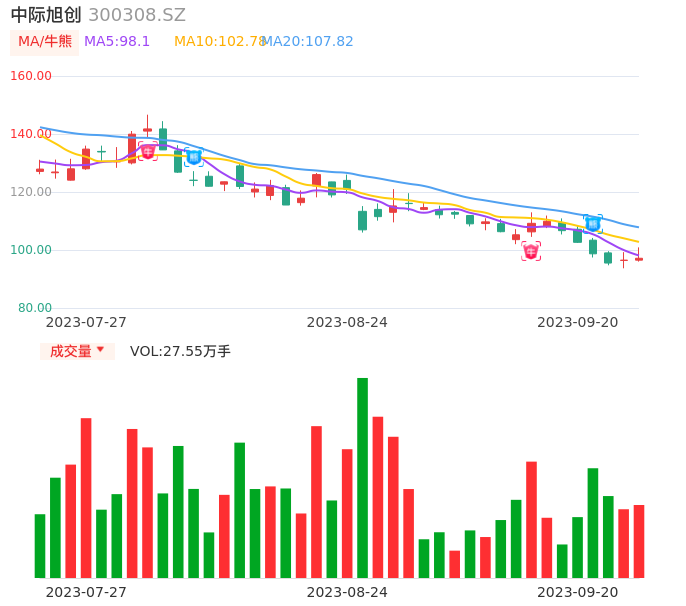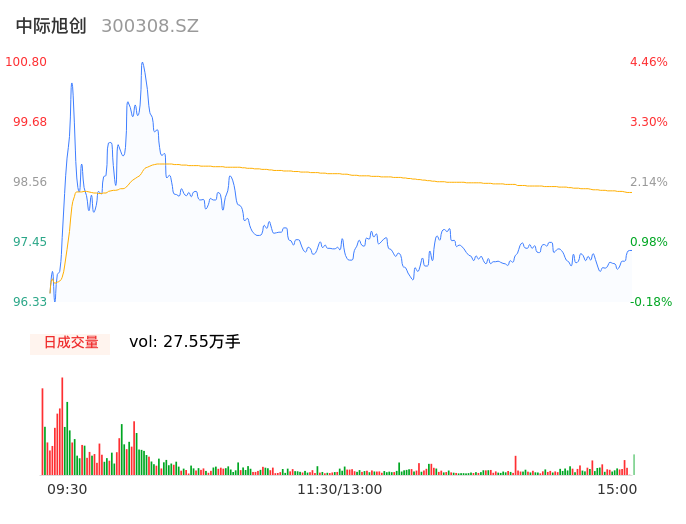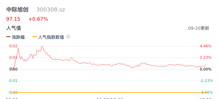 09月20日,中际旭创收报97.15,股价涨幅0.67%,成交金额27.10亿元,换手率3.67%。
