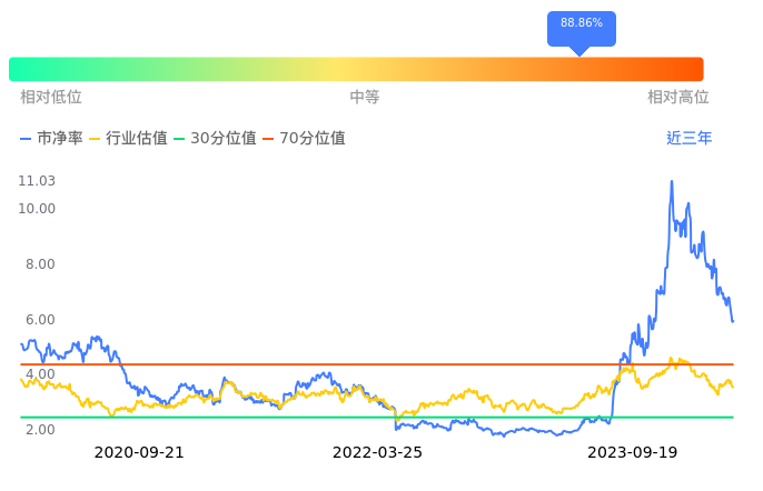 中际旭创当前市净率PB为6.01,在所属的通信设备中,市净率PB排70,前五名分别为亨通光电市净率1.39、中天科技市净率1.49、辉煌科技市净率1.52、共进股份市净率1.54、高鸿股份市净率1.55。中际旭创当前市净率PB为6.01,超过近3年88.86%的历史数据。