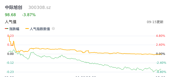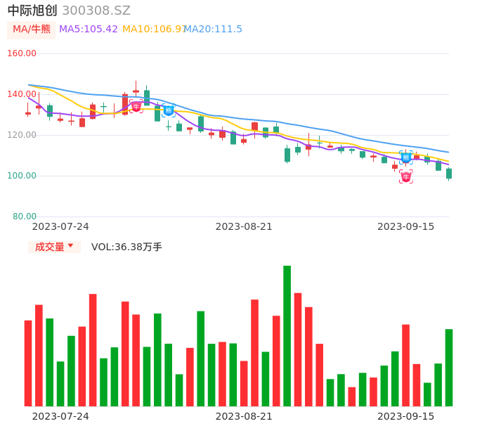 09月15日,中际旭创收报98.68,股价涨幅-3.87%,成交金额36.52亿元,换手率4.85%。