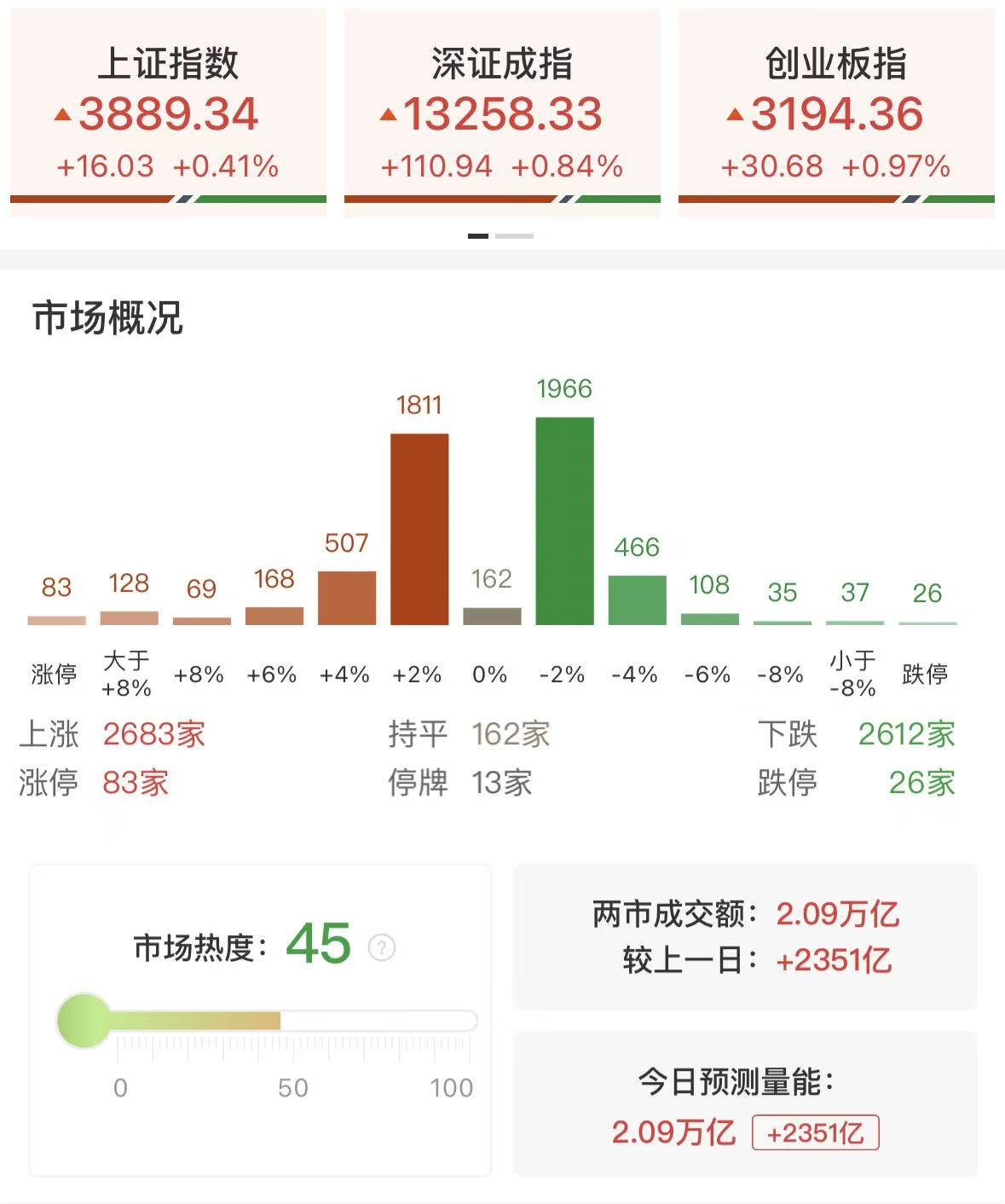 财联社12月12日讯,市场探底回升,三大指数全线收红,创业板指近1%。沪深两市成交额2.09万亿,较上一个交易日放量2351亿。盘面上,市场热点快速轮动,全市场涨跌家数接近持平。从板块来看,商业航天概念延续强势,再升科技等20余股涨停。可控核聚变概念走强,国机重装、中洲特材等多股涨停。电网设备概念快速拉升,中能电气、保变电气涨停。半导体设备股反复活跃,亚翔集成涨停续创历史新高。下跌方面,零售概念下挫,中央商场跌停。截至收盘,沪指涨0.41%,深成指涨0.84%,创业板指涨0.97%。