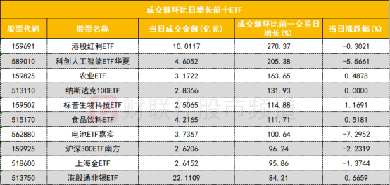 从成交额环比增长前十的ETF来看,港股红利ETF(159691)成交额环比增长270%位居首位;科创人工智能ETF华夏(589010)成交额环比增长205%位居次席。