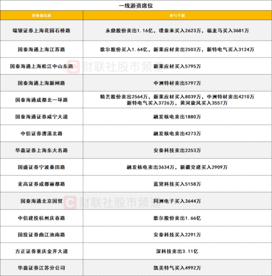 一线游资活跃度一般,歌尔股份获一家一线游资席位买入1.64亿,同时遭另一家一线游资席位卖出1.66亿。新莱应材获两家一线游资席位合计买入1.38亿,同时遭另一家一线游资席位卖出2503万。深科技遭方正证券重庆金开大道营业部席位卖出3.11亿,值得注意的是该席位昨日净买入3亿。