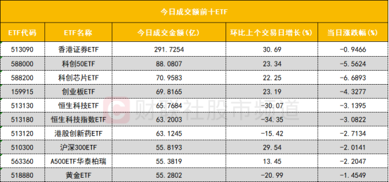从成交额前十的ETF来看,香港证券ETF(513090)成交额位居首位,科创50ETF(588000)成交额位居次席。