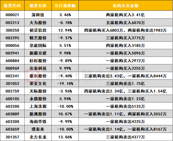 今日龙虎榜机构活跃度较高,买入方面,芯片概念股深科技获两家机构买入3.41亿,另一只芯片概念股大为股份获五家机构买入6070万。