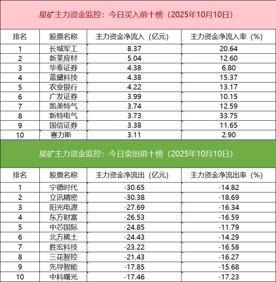 从个股主力资金监控数据来看,主力资金净流入前十的个股所属板块较为分散,长城军工净流入居首。