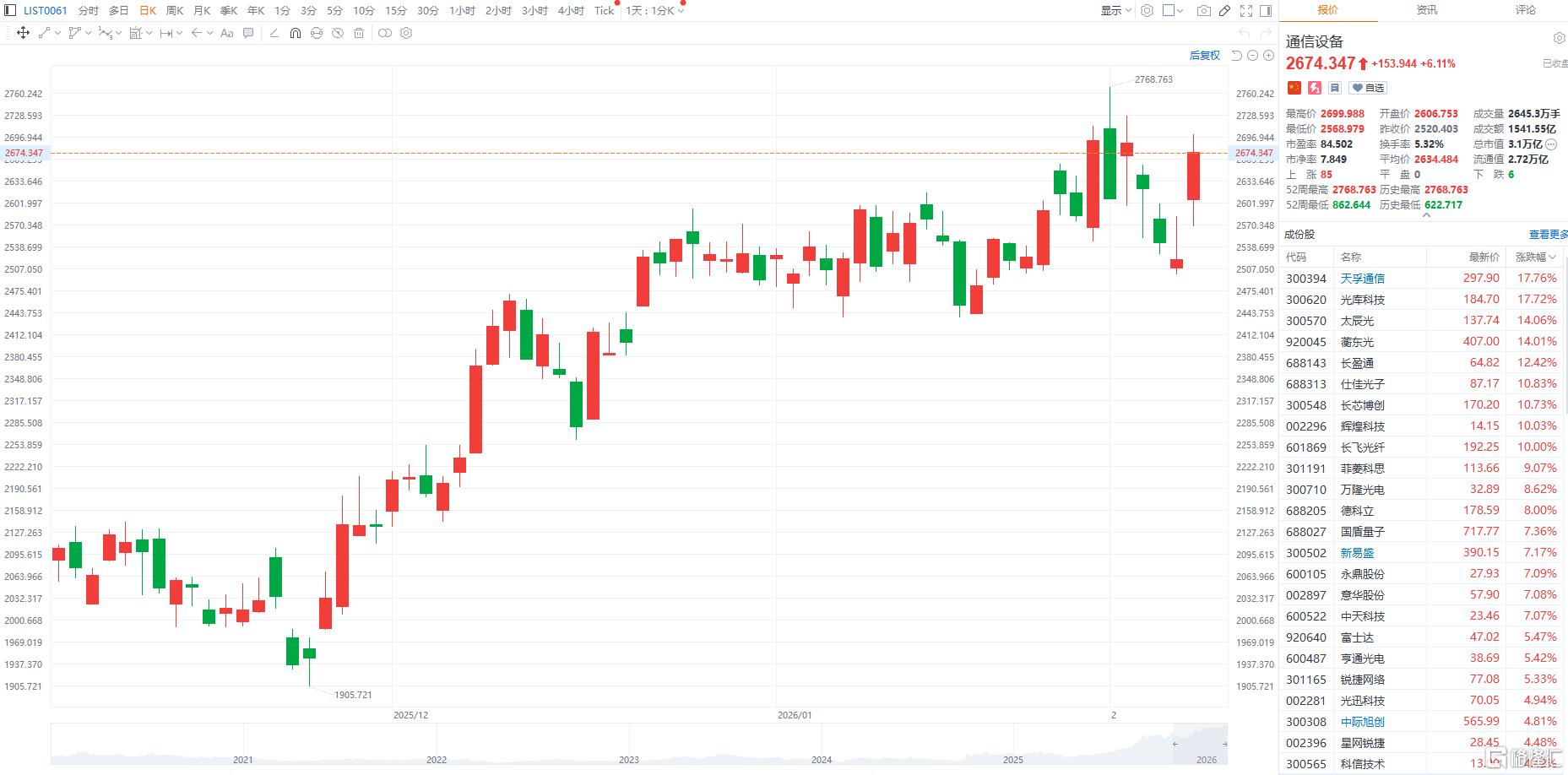 截至收盘,杰普特、长飞光纤、兆驰股份、安孚科技涨停;光库科技、长芯博创、国盾量子等纷纷大涨。