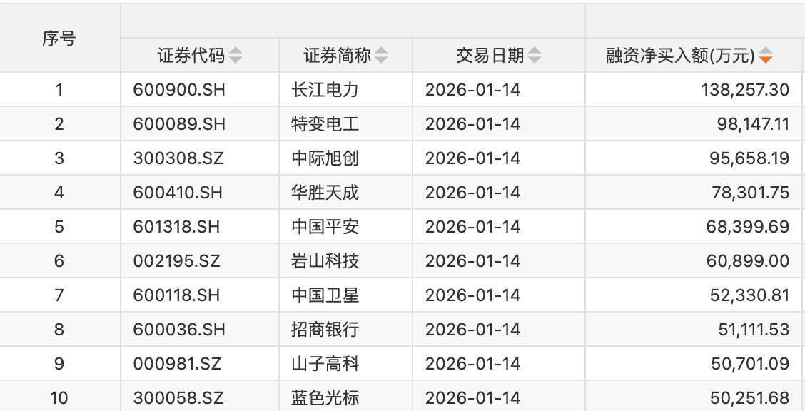 个股方面,87只个股获融资净买入额超1亿元。长江电力获融资净买入额居首,净买入13.83亿元;融资净买入金额居前的还有特变电工、中际旭创、华胜天成、中国平安、岩山科技、中国卫星、招商银行、山子高科、蓝色光标等。