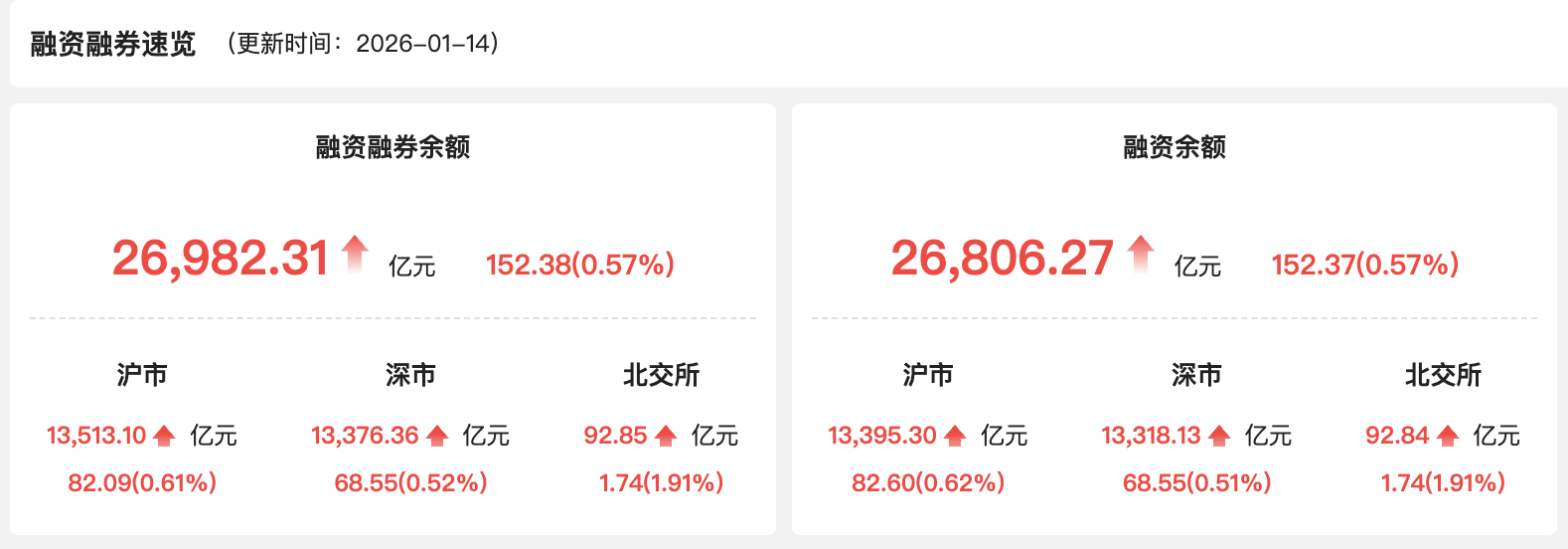 上证报中国证券网讯1月14日,A股两融余额为26982.31亿元,较上一交易日增加152.38亿元,占A股流通市值比例为2.60%。当日两融交易额为4519.11亿元,较上一交易日增加467.6亿元,占A股成交额的11.33%。