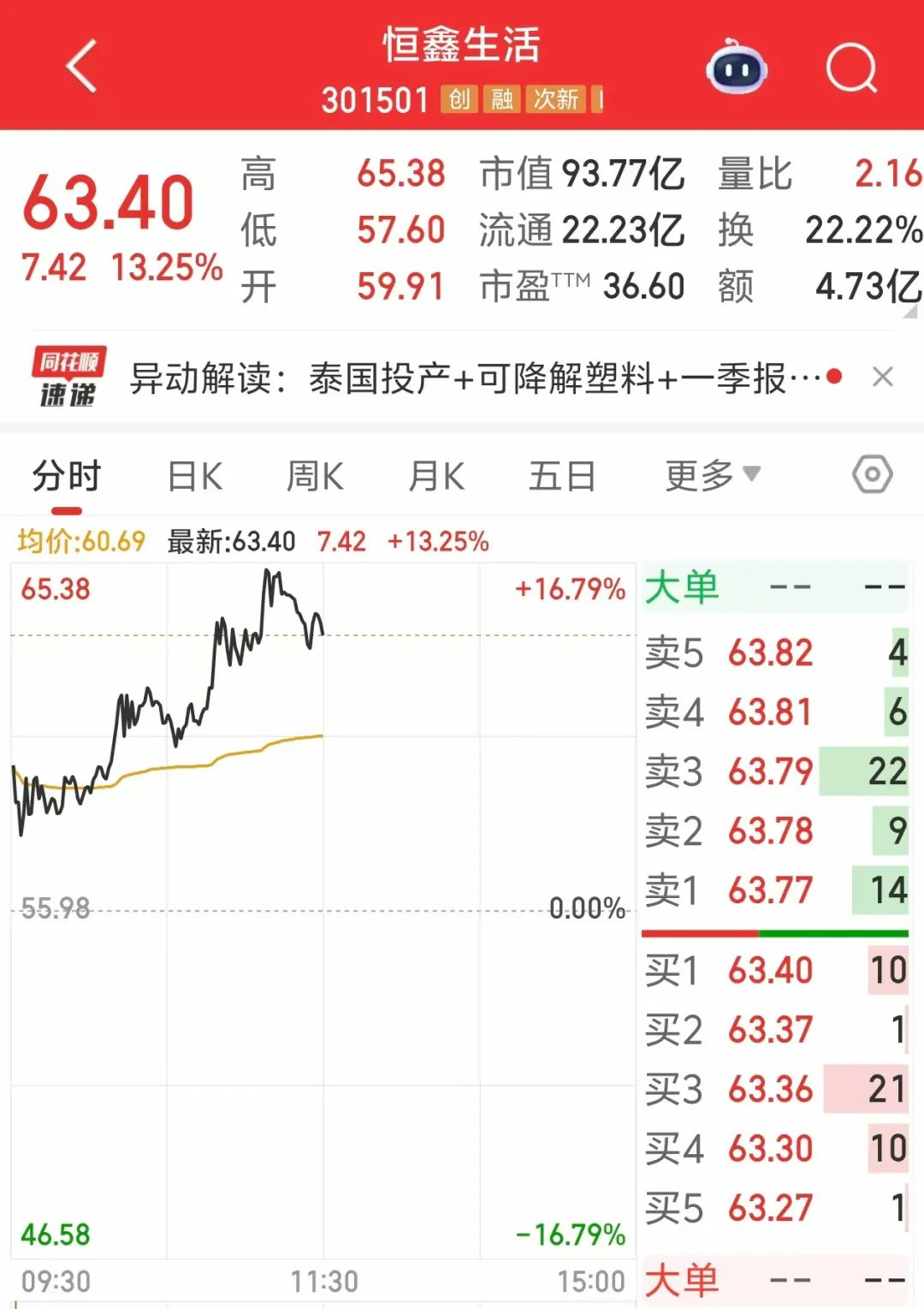 被投资者称为“外卖铲子股”的恒鑫生活(301501),今天上午涨超13%。