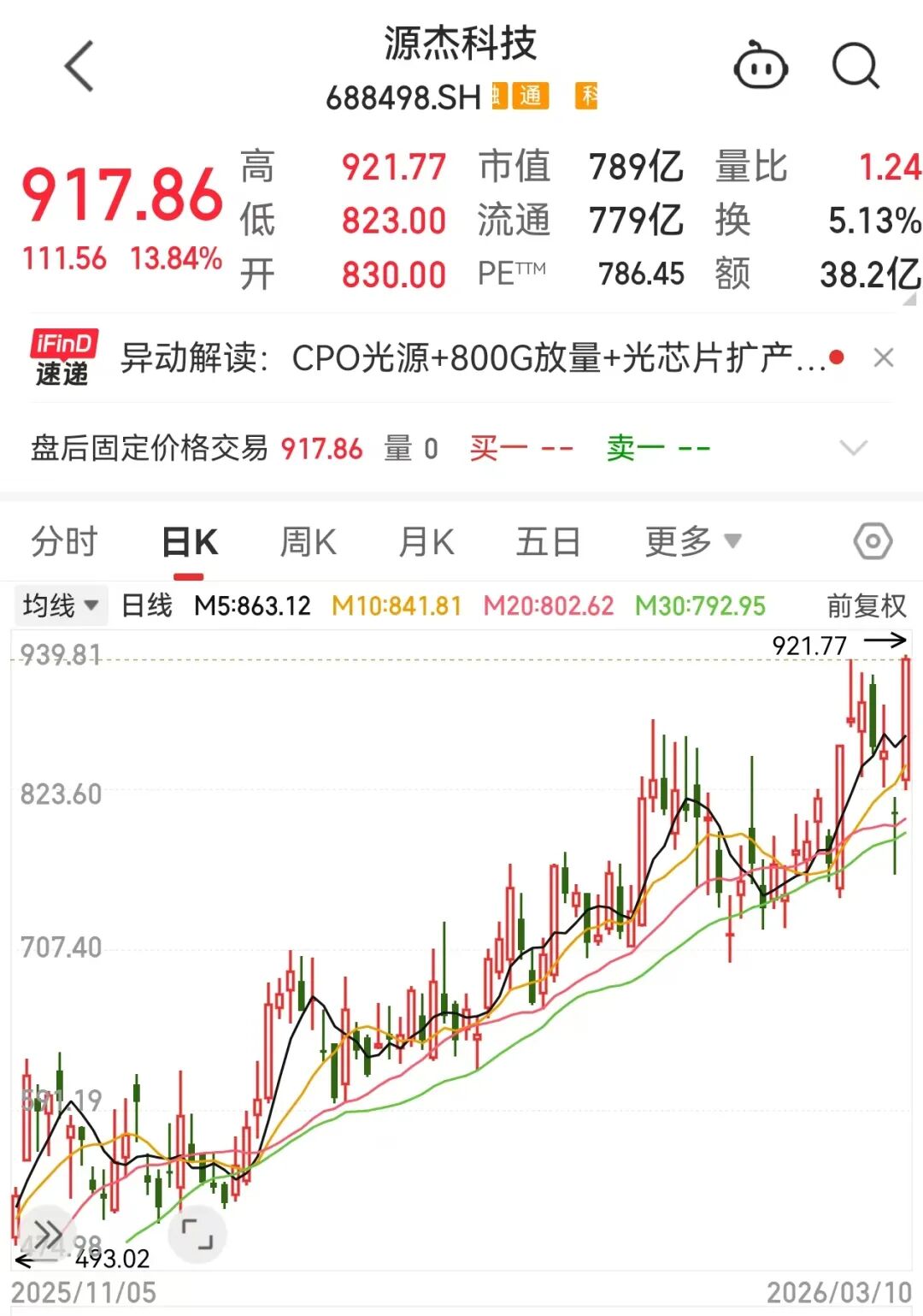 10多只通信、电子股股价创出历史新高,包括东山精密、佰维存储、源杰科技等。其中,源杰科技(688498)重回900元上方,收报917.86元/股,创历史新高,进一步逼近千元大关,仅次于贵州茅台和寒武纪-U,为A股第三高价股。公司已完成十倍股之旅,2024年9月该股不足80元,低点以来涨幅接近11倍。