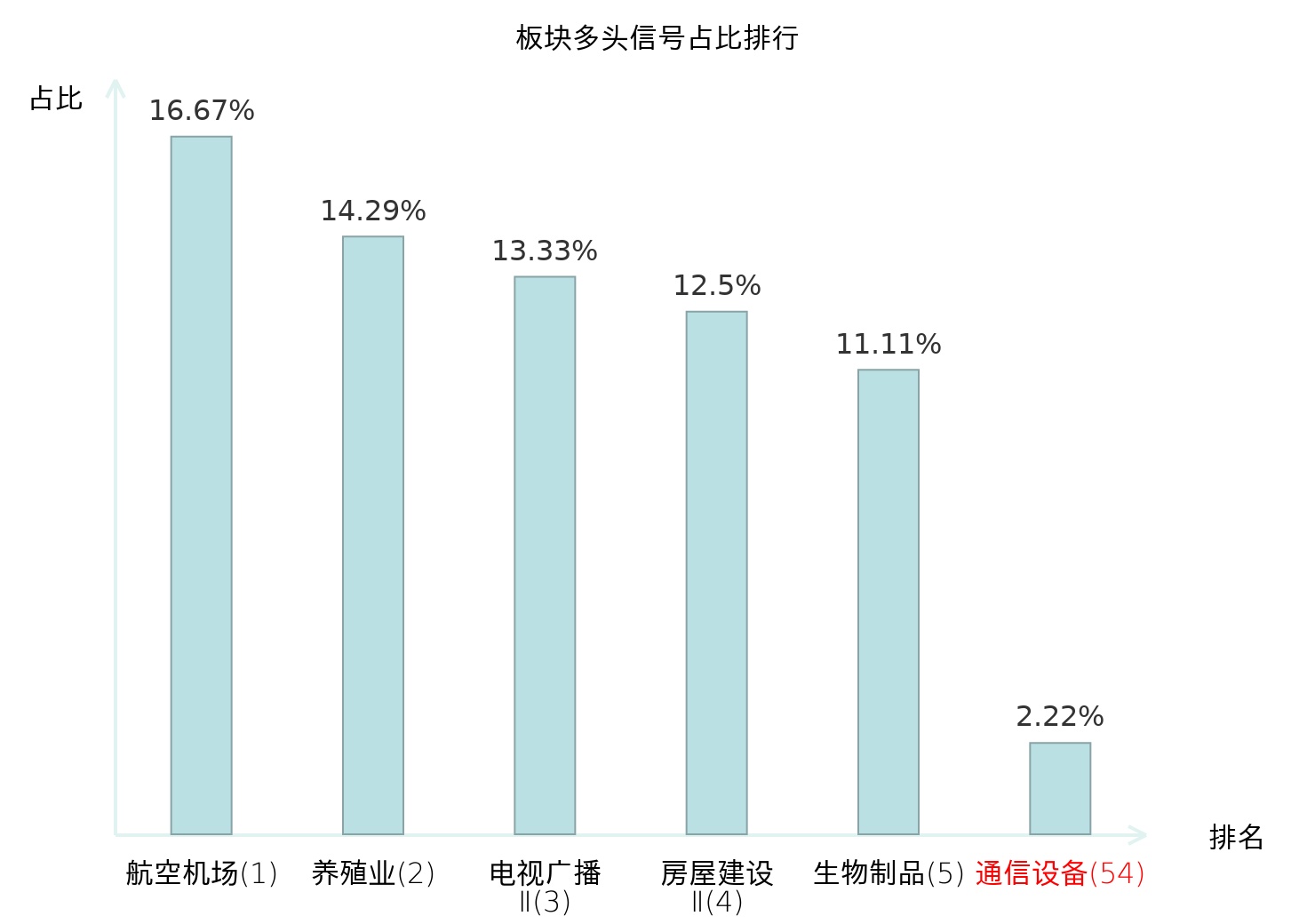 全市场所有行业板块中主力多头信号占比排名中,航空机场板块位居第一。航空机场板块名次提升最快,较昨日上升113位。