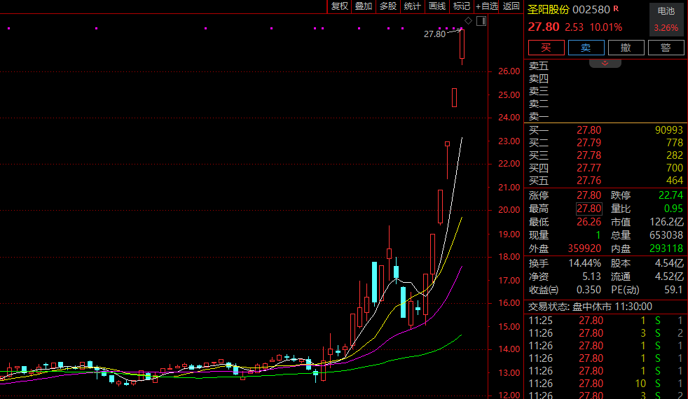 电池产业早间全线上攻,板块指数一度大涨近5%,创近4年新高。龙蟠科技高开后秒速涨停,圣阳股份(002580)仅约7分钟直线涨停,连续第6日涨停,今年以来飙升逾123%,科达利、鹏辉能源等涨停或涨超10%。