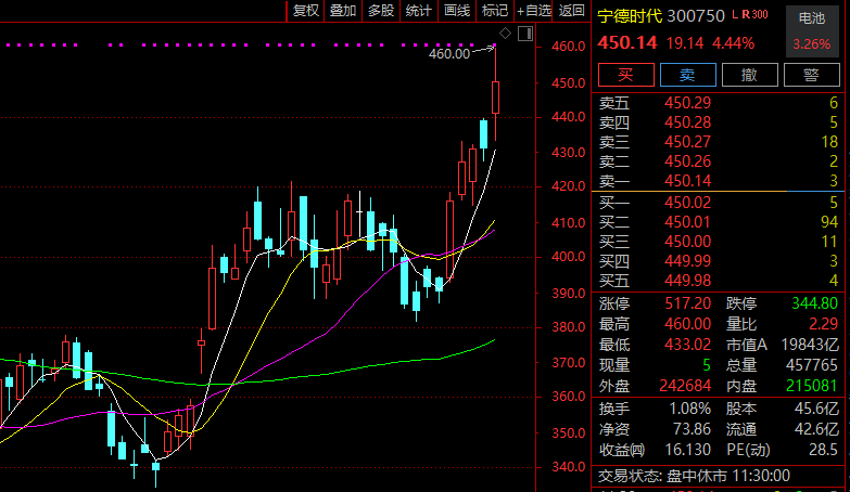 受业绩大增刺激,宁德时代AH股早间均大幅高开高走,并双双创出历史新高,AH总市值突破2万亿元,其中A股市值连续超过贵州茅台、中国石油,成为A股第三大市值公司。