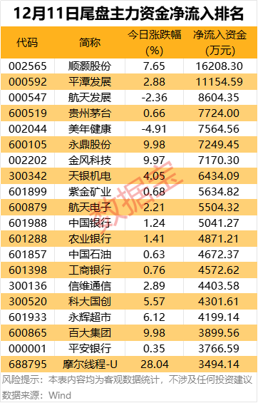 个股方面,顺灏股份、平潭发展尾盘主力资金净流入均超1亿元,航天发展、贵州茅台、美年健康、永鼎股份、金风科技净流入均超7000万元。