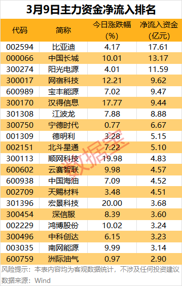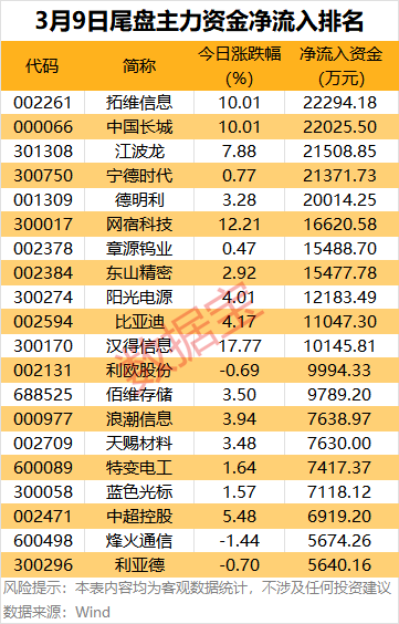 个股方面,拓维信息、中国长城、江波龙、宁德时代、德明利5股尾盘主力资金大幅净流入均超2亿元。网宿科技、章源钨业、东山精密、阳光电源、比亚迪、汉得信息等股尾盘主力资金大幅净流入均超1亿元。