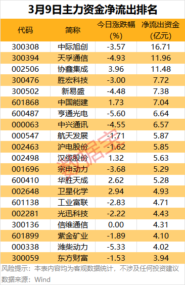 今日有62股主力资金净流出超2亿元,其中,中际旭创、天孚通信、协鑫集成、胜宏科技、新易盛、中国能建、亨通光电、中兴通讯等股主力资金净流出金额居前。