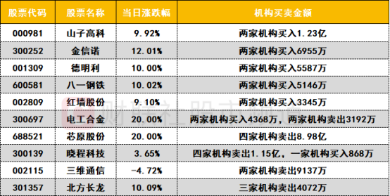 卖出方面,芯片概念股芯原股份遭机构卖出8.98亿,黄金概念股晓程科技遭机构卖出1.15亿,卫星互联网概念股三维通信遭机构卖出9137万。