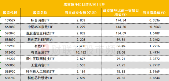 从成交额环比增长前十的ETF来看,标普消费ETF(159529)成交额环比增长174%位居首位;中证A500指数ETF(563880)成交额环比增长144%位居次席。