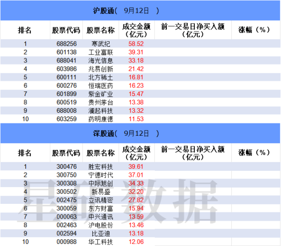从沪股通前十大成交个股来看,寒武纪位居首位;工业富联和海光信息分居二、三位。