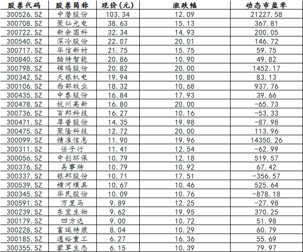 昨日涨停的24只创业板个股,其中12只最新价格低于10元。西部牧业中创环保聚灿光电东宝生物宜通世纪向日葵天海防务东方电热京天利市盈率超过100倍,西部牧业中创环保市盈率分别高达849.57倍和462.75倍,豫金刚石乾照光电熙菱信息百邦科技任子行长方集团华鹏飞坚瑞沃能天山生物动态市盈率为负数。