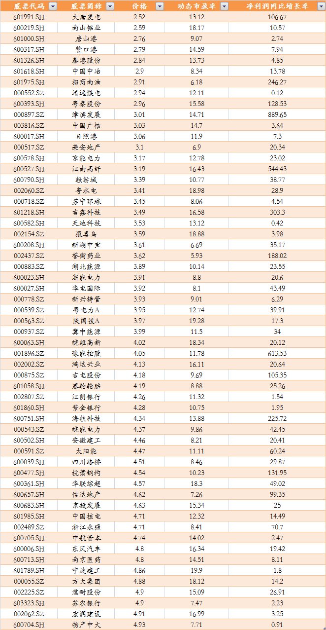 数据显示,目前创业板股价低于5元的公司只有华谊嘉信融捷健康安控科技铁汉生态宝利国际中金环境嘉寓股份美晨生态8家。非创业板公司中股价低于5元的公司仍近600家,剔除掉ST仍有近460家,半年报实现增长,且动态市盈率低于20倍(剔除负值)的公司有近60家,在低价股风格行情下,这些具备一定业绩支撑的低价股或成资金下一步关注的目标。