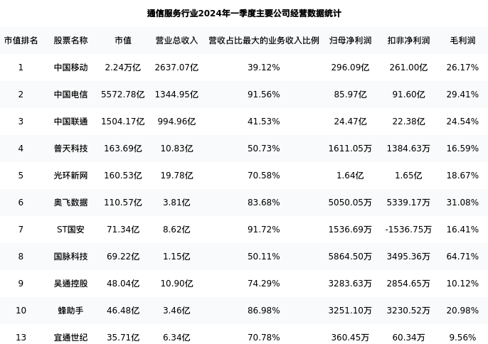 宜通世纪最新报告期数据为一季度,下表汇总了通信服务行业内市值靠前的公司一季度主要经营数据