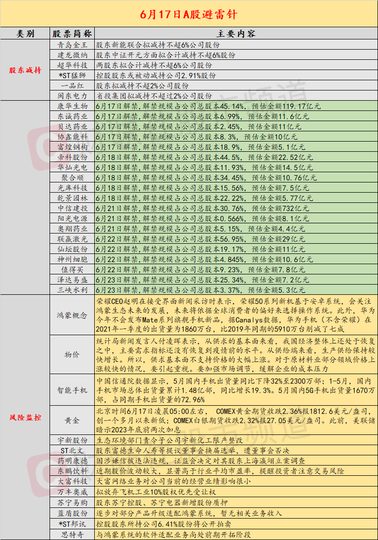 导读:1、超华科技、青岛金王、建龙微纳等个股将迎来6%的大比例减持;2、荣耀CEO表示荣耀50系列仍然基于安卓,华为今年不会发布Mate系列新手机;3、生态环境部门责令宇新股份子公司宇新化工限产整改;4、统计局表示中国供求基本面不支持物价大幅上涨;5、美联储首提2023年底前两次加息,隔夜美股三大指数集体收跌;6、泰国卫生部预计三个月内印度报告的变异病毒或将在全国传播。