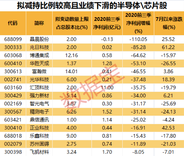 统计显示,上述58股中前三季业绩下滑或者亏损股有20只,其中7月以来股东拟减持比例合计超1%的个股有15只,富瀚微、博通集成、乐鑫科技等5股拟减持比例上限均超过5%。