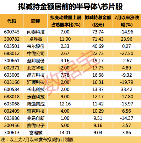 数据宝梳理发现,以上58只半导体、芯片股今年上半年积累了过高的涨幅,58股上半年平均涨幅超过40%,7月以来发布减持计划或多或少与业绩有一定关系。
