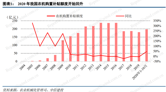 首先,从补贴总量来看,2020年1-10月我国农机购置补贴额度已达197.26亿元,超过2019年全年的180亿元,是2017年以来的首次回升,说明我国已经加大对农机行业的扶持力度。