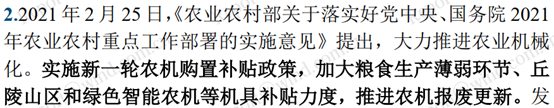 其次,根据2021年2月21日发布的中央一号文件,我国十四五期间将加大农机购置补贴力度,未来补贴总额仍会上升。补贴的重点方向是绿色高端农机以及丘陵山区农机等。这类农机技术壁垒高、研发投入大,只有龙头企业才有技术和资金实力进行研发生产。未来补贴资源将进一步向头部企业集中,显然利好头部企业发展。