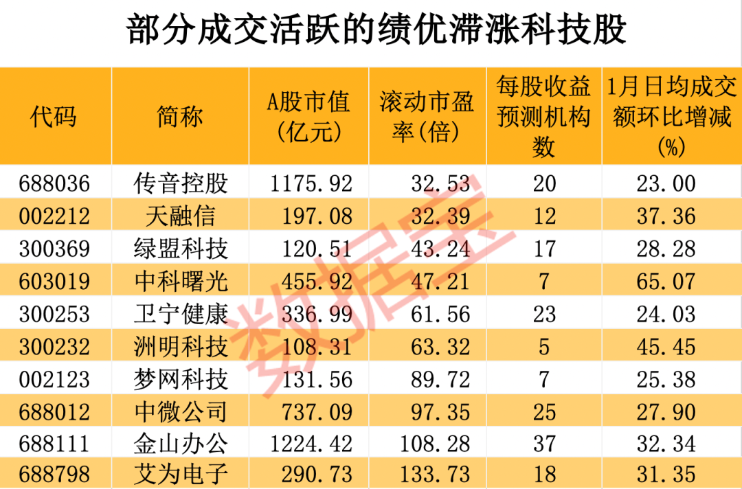 通常而言,在股价底部区间,成交量放大意味着有大资金参与,短期内反弹概率较大。数据宝统计显示,1月份日均成交额环比上个月增幅20%以上,且最新收盘价较2021年以来低点涨幅不足30%的科技股,合计86只。