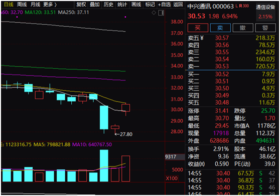 行情数据显示,中兴通讯A股(000063.SZ)今天一改前一段时间的弱势,股价放量大涨,截至收盘,中兴通讯A股大涨6.94%,全天成交33.9亿元。