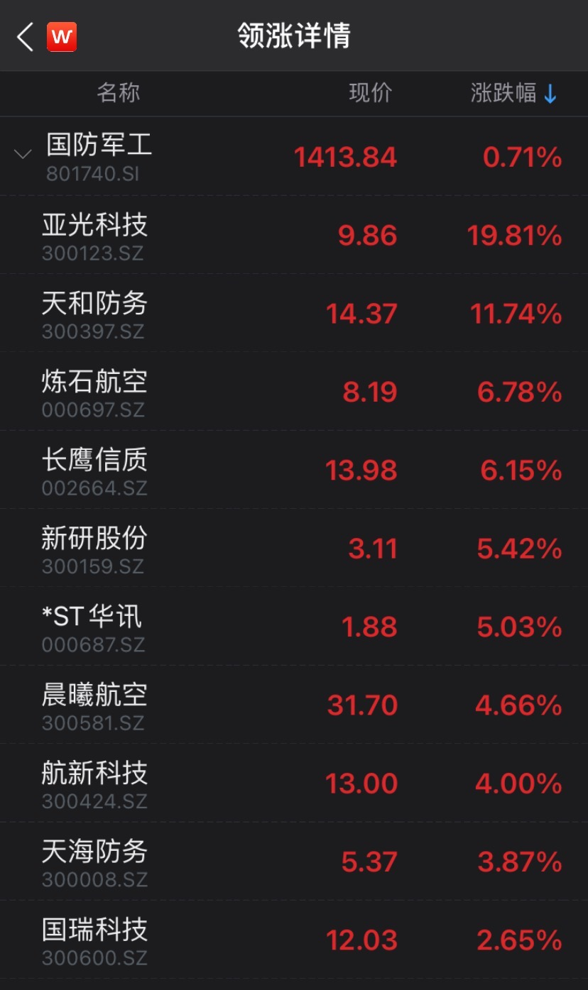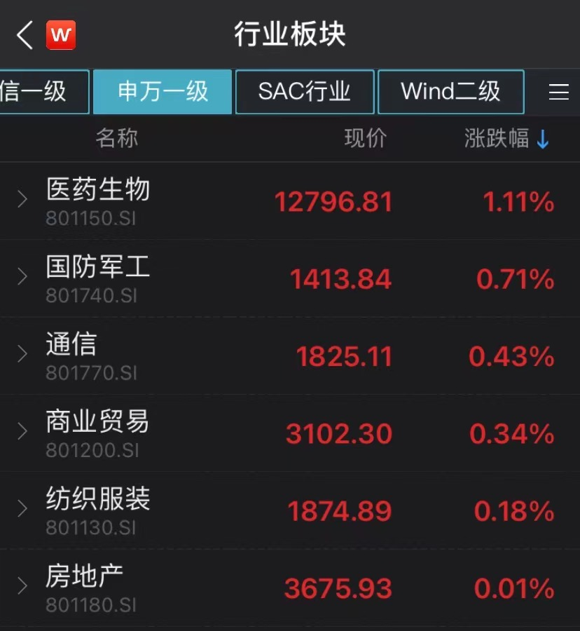 Wind数据显示,截至午间收盘,医药生物、国防军工、通信板块分别涨1.11%、0.71%、0.43%,涨幅位列申万一级行业板块前三。