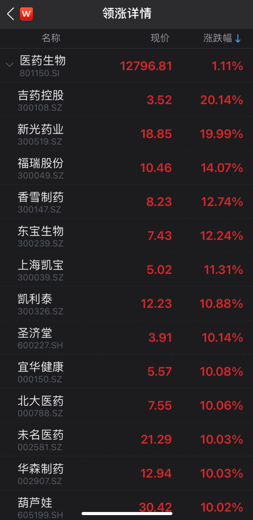 医药生物板块掀起涨停潮,吉药控股、新光药业、圣济堂、宜华健康、北大医药等15只个股涨停。