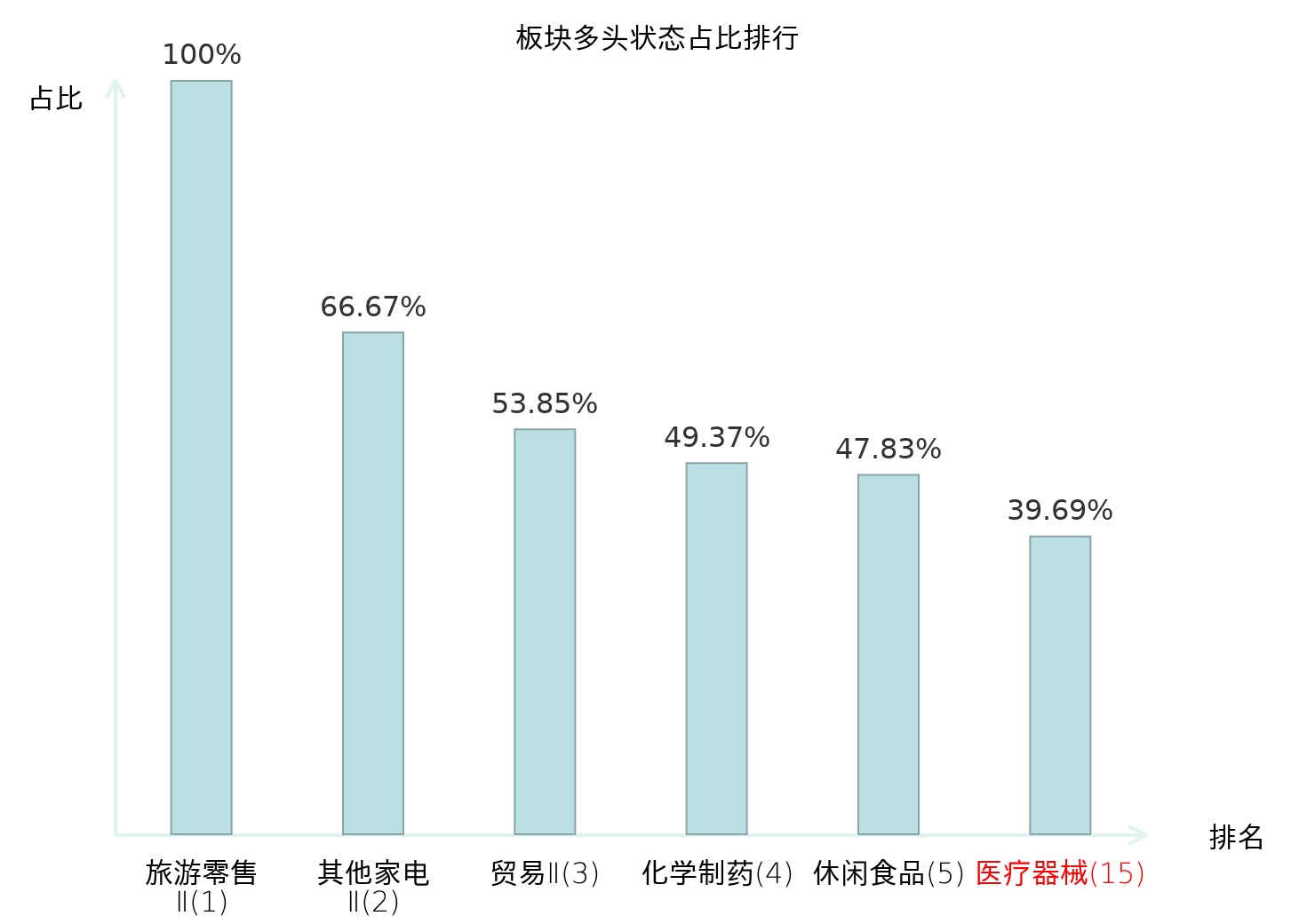 全市场所有行业板块中主力多头状态占比排名中,旅游零售Ⅱ板块位居第一。互联网电商板块名次提升最快,较昨日上升55位。