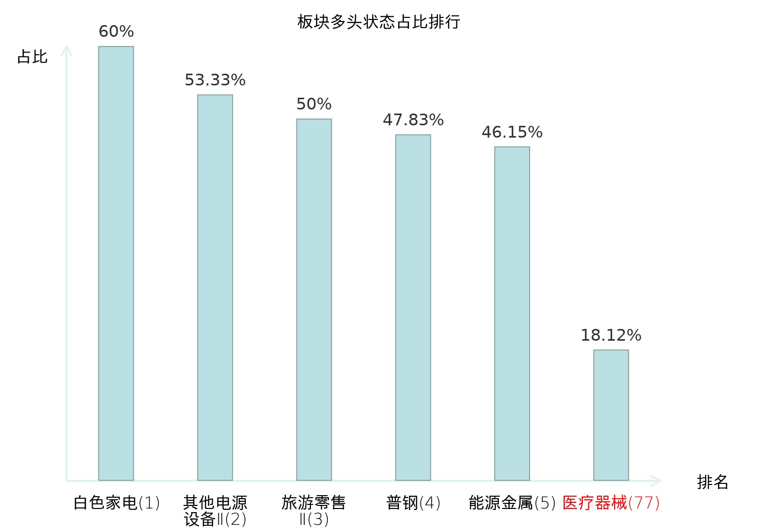 全市场所有行业板块中主力多头状态占比排名中,白色家电板块位居第一。照明设备Ⅱ板块名次提升最快,较昨日上升55位。